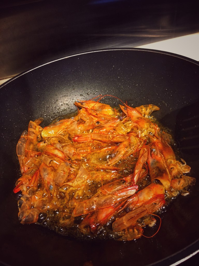 - Heat a pot on the stove top and fry your prawn shells with a ¼ cup of vegetable oil till the shells turn a rich red colour 8-10 minutes.