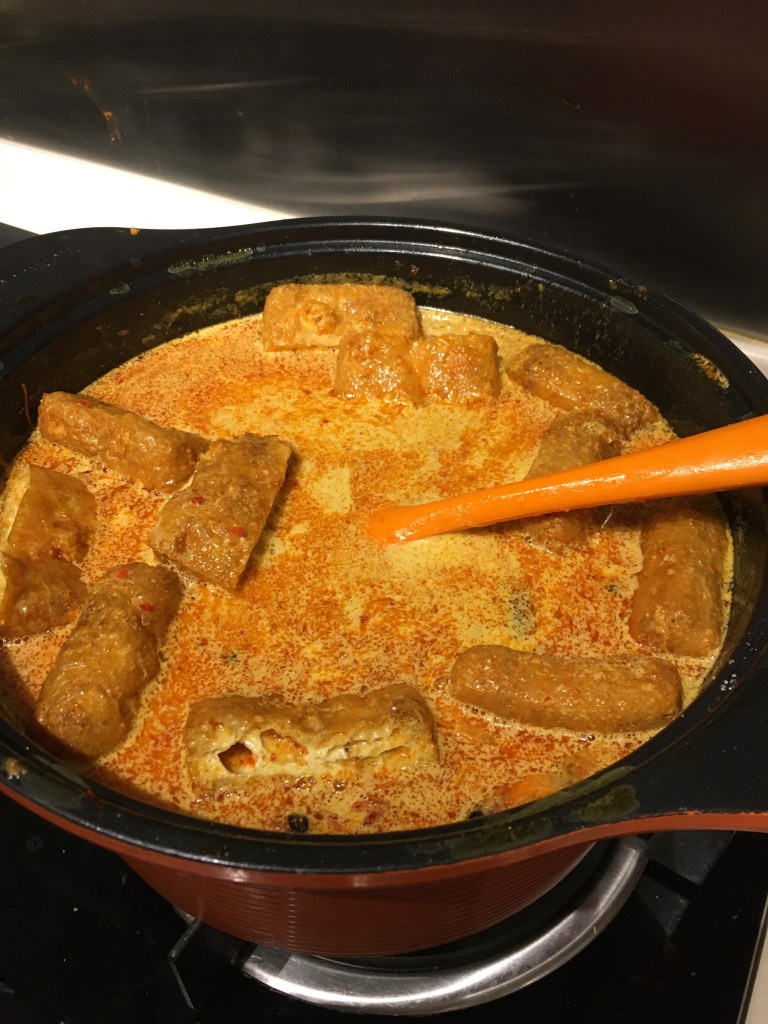 - Blanch the tofu puffs in boiling water for 1 minute, remove and reserve. just before serving your going to add to the laksa gravy (see below photo)