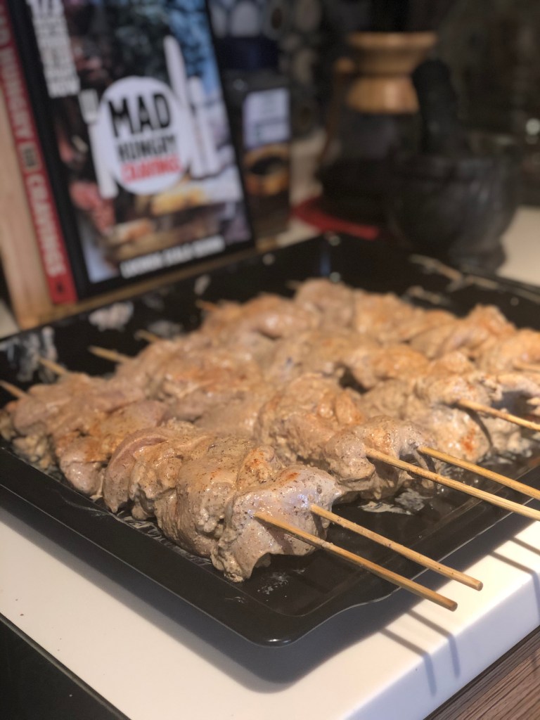I Grilled my chicken on skewers on my Weber Grill at full blast around 350c for 6 minutes per side.