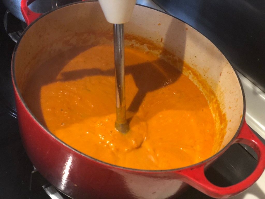 Remove the spice bag and add tomatoes & red capisum stock to the tempered spices. Simmer over low heat for 30 minutes. Blend with a stick blender till smooth and velvety.