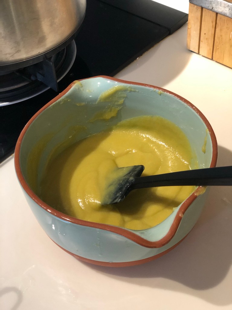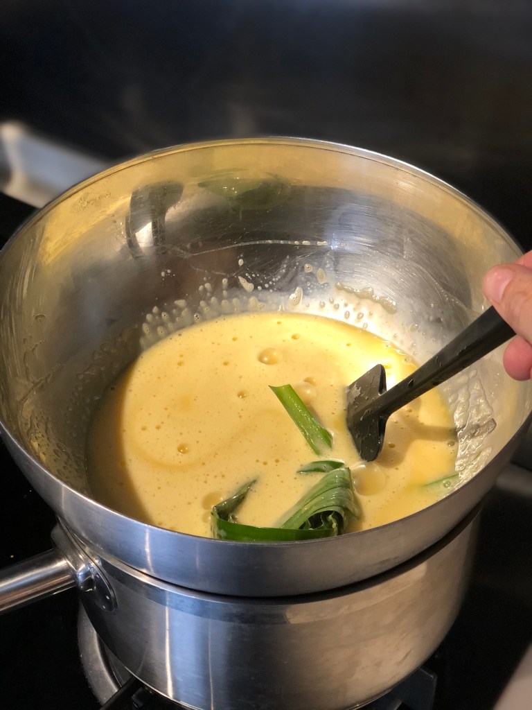 Remove the pandan from the kaya and using a stick blender (or a food processor if you don’t have one), and blend until the kaya is silky smooth. At this point you can add 1 1/2 tsp corn flour mixed with some water and cook it out for a two minutes, jar it and be done but we are going a little more old school.