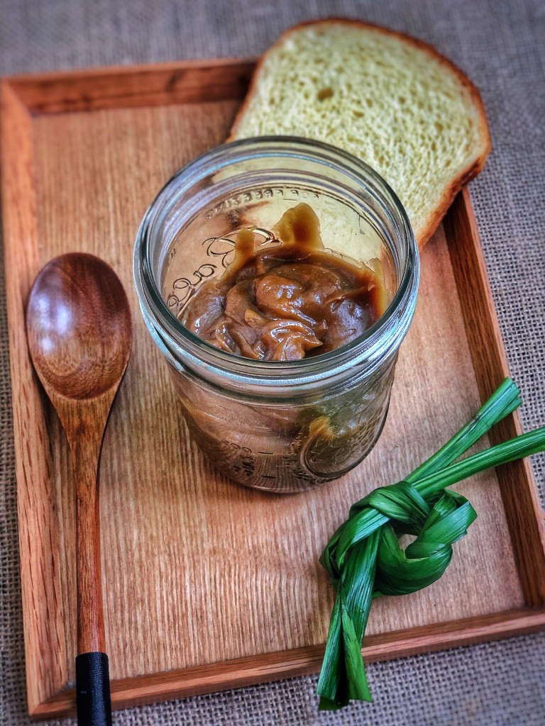 Kaya by nature is very simple. It’s just coconut jam – I think of it like an Asian curd. Thickened by the eggs and aromatically scented by the pandan leaves infused within, kaya makes me very nostalgic. That distinctive sweet caramel custard-like scent wafting through the humid Singapore air (we had no air-conditioner growing up), whetting my tastebuds as I dream of my first bite of toast spread generously with that chestnut-coloured thick jam.